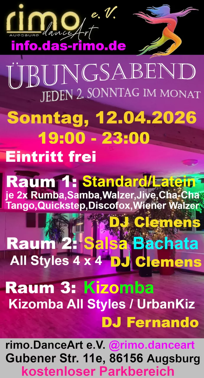 Immer am 2. Sonntag im Monat können alle Schüler der rimo-Tanzkurse ihre gelernten Schritte und Bewegungen in familiärer Atmosphäre üben und sich mit anderen Teilnehmern austauschen. Mit dabei sind auch die Tanzlehrer, die gerne weiterhelfen, wenn es mal klemmt.