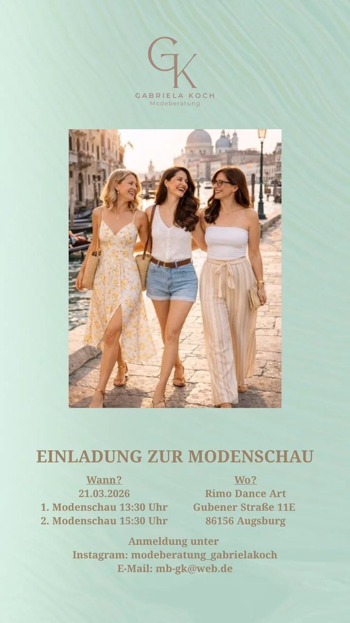 Die Modeberaterin aus Leidenschaft lädt Augsburg und Umgebung (die Welt?) in die heimeligen Räumlichkeiten des Rimo.DanceArt zu einer einzigartigen Mischung aus Modenschau und stilvollem Miteinander.