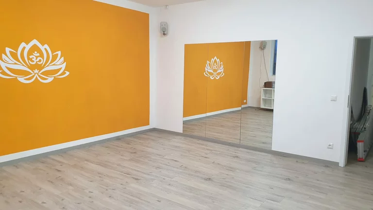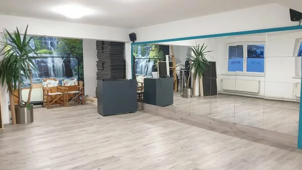 Raum 1 wird gerne für kleinere Kurse genommen. Durch seine Westlage ist der tagsüber sehr hell und freundlich. Er verfügt über eine Spiegelwand, eine gepolsterte Sitzbank und ein DJ-Pult mit kompletter Musikanlage.