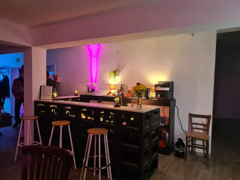 Ausstattung: große Spiegelwand, 2 gepolsterte Sitzbank, Stehtische und ein DJ-Pult mit kompletter, leistungsstarker Musikanlage: auch für Konzerte aller Art geeignet.
